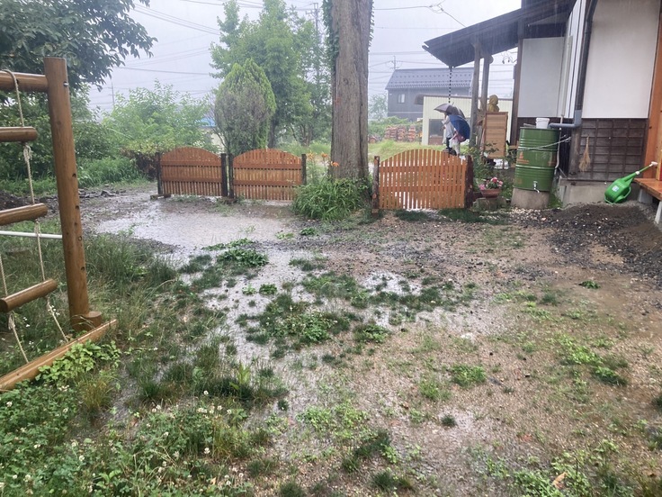 この考えに基づき、2020年の移転以来、子どもたちの個性を尊重し、感性を育む環境作りをおこなってきました。子どもたちには自然のものに触れてもらいたくて、砂場やブランコ、うんていなど地元の木を使って手作りで整備しています。しかしながら、2年連続で芝生の種を蒔きましたが、土が剥き出しのままだったり、木々に囲まれているものの、日陰がうまく作れず園庭に直射日光が当たってしまったり、水はけが悪いため、雨が降ると園の通路に水溜りができて保護者の方(おじいちゃんおばあちゃんも送迎に来てくれています)に大変な思いをさせてしまったりと、根本的な部分には対応できず、やるせない思いを抱いていました。
