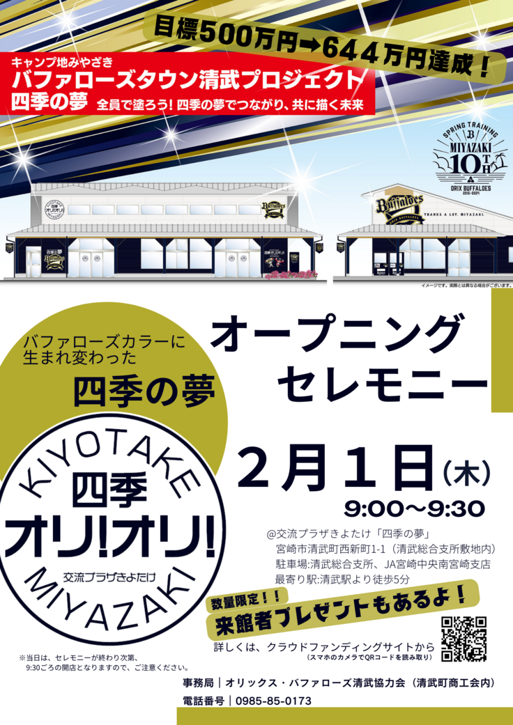 プロジェクト本文に記載していたスケジュールでは2月中旬としておりましたが、キャンプインに間に合う目処が立ちましたので、令和6年2月1日(木)9時に決定いたしました。