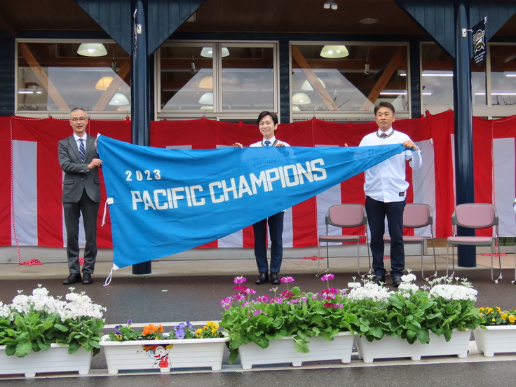 球団からは、リーグ優勝のご報告の意味も込めて、パ・リーグチャンピオンフラッグを贈呈していただきました。キャンプ期間中は、清武総合支所に掲揚しています。