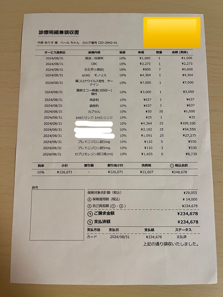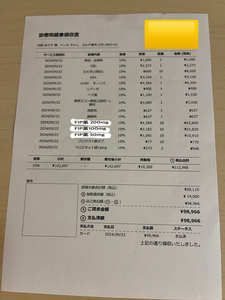 しかしFIPの薬代以外に検査費、入院費、FIP起因ではないと考えられている炎症のための治療費など薬以外の治療費もかなりかかってきております。