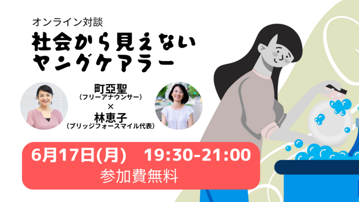 私たちブリッジフォースマイル(B4S)を、ずっと応援してくださっている、元ヤングケアラーだったフリーアナウンサーの町亞聖さんを迎え、ブリッジフォースマイル代表の林恵子と、【社会から見えないヤングケアラー】をテーマにオンライン対談を行います。当事者だった町さんの経験を通して、ヤングケアラーを社会全体でどう支援していったらよいか、子どもたちが夢や希望を諦めずに大人になっていく手助けができるのか、考えていきたいと思います。