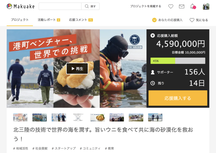 ▶︎北三陸の食のブランディングと、うに再生養殖を行う北三陸ファクトリーの取締役の眞下さんにはヤムヤムのクラファンに参加していただいております。
