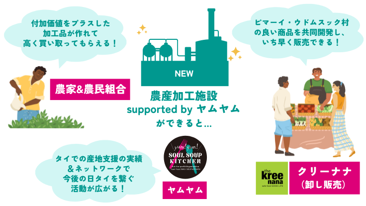 この3者をまとめて支援している団体が作る現地の半官半民支援団体「チョンコーパッタナー農民組合」から、昨年7月にヤムヤムへ直接相談のメッセージが舞い込み、現地へ視察へ赴いたことで今回のクラファンの実施、プロジェクトの実現につながりました。