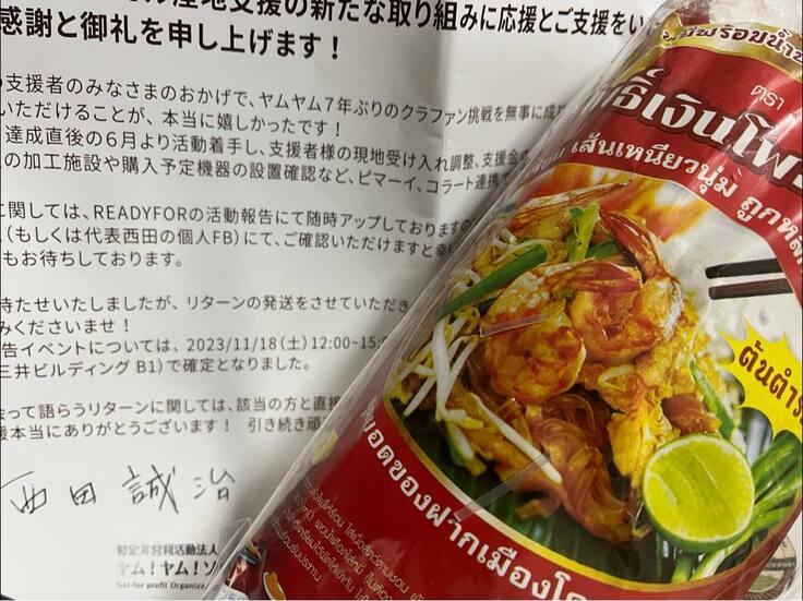 プロジェクトの完了報告と今後の見通しを直接お伝え致します。この日のために特別にご用意するタイ料理&タイのお酒(通常6,500円相当×1名)をお楽しみいただけます。