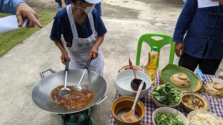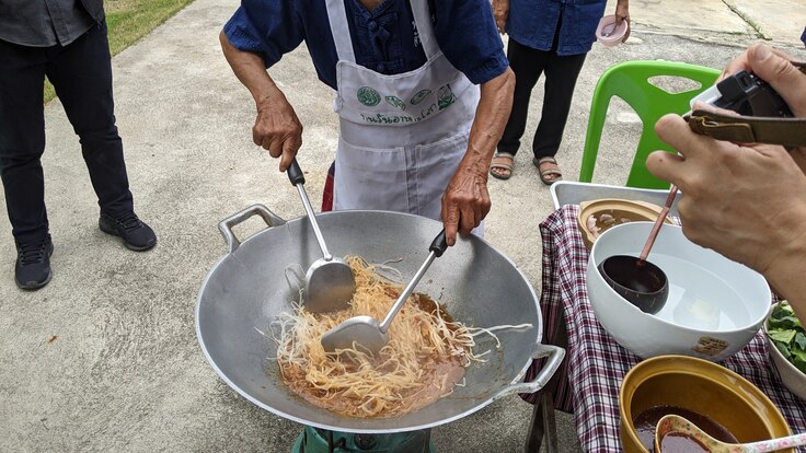 日本の焼きそばのように強火でガンガン炒める料理ではなく、火力は割と弱目で水分を麺に吸わせながら、事前に炒めた豚肉や葉野菜を順番に仕上げに加えながら、全体をなじませる感じです。