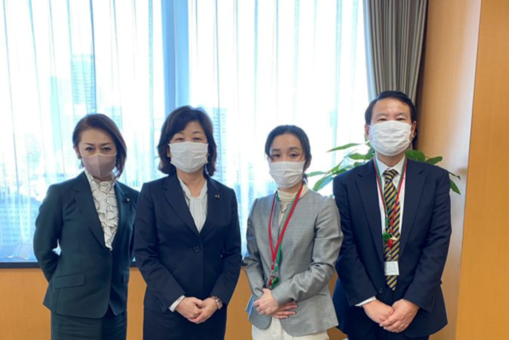 (2022年1月訪問時)内閣府特命担当前大臣 野田聖子議員、前大臣補佐官 三原じゅん子議員に病児保育事業の充実にむけて陳情にうかがった際も、昨年実施したクラウドファンディングについてお話してきました。お取り計らいいただいた大和市議会中村一夫議員とともに大臣室にて。