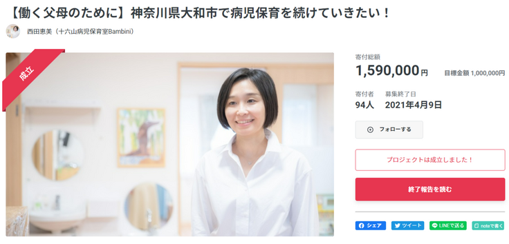 前回のプロジェクト、【働く父母のために】神奈川県大和市で病児保育を続けていきたい!は支援者の皆さんのおかげで大成功のうちに終わっただけでなく、大手新聞社、テレビ取材へつながりました。