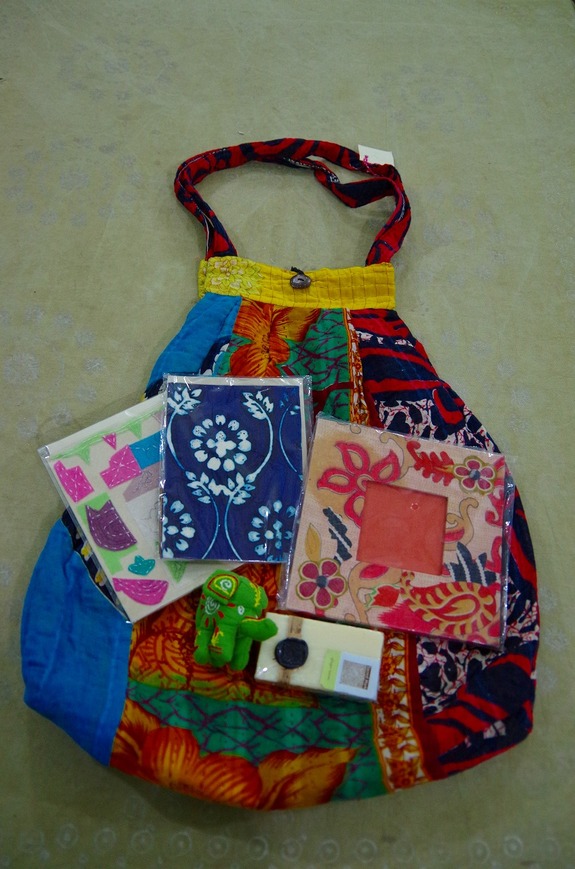サリー生地のカバンと手工芸品5品の写真です。