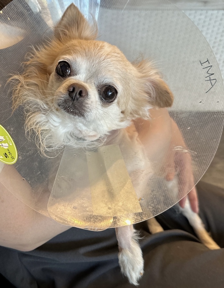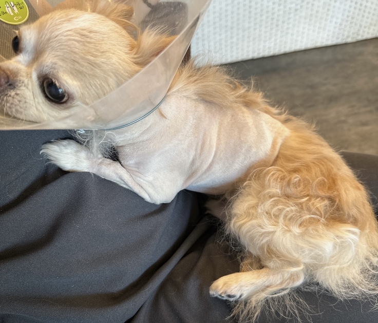 半分毛をかられてエリザベスカラーをつけられていました。お口などにはチュール?が沢山付いていました。