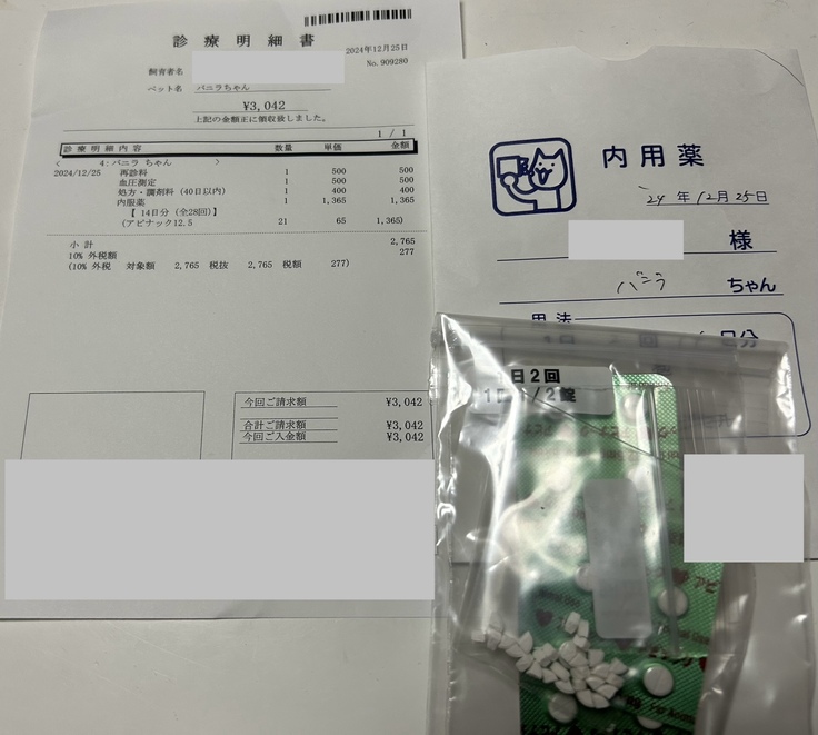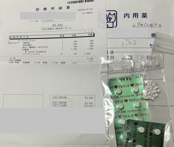 アピナック12.5mgを1回4/3錠を1日2回服用する事になりました。服用始めて少し気分が悪そうで先生に相談してみましたがとりあえずしばらく服用する事になりました。12/25にも診察していただきましたが血圧変化なし。