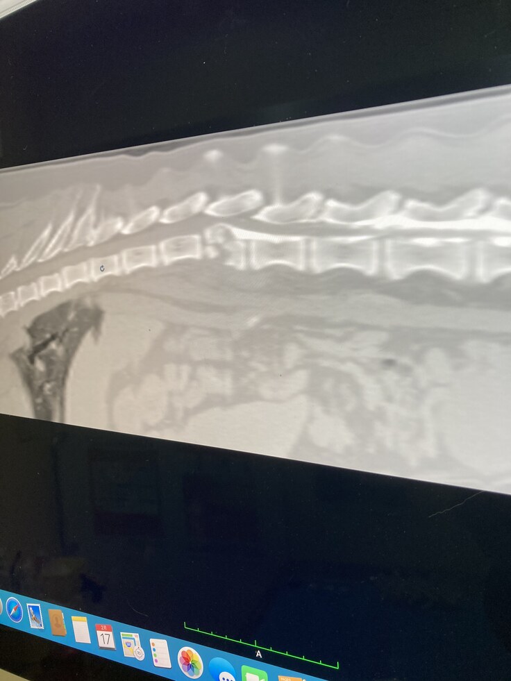 バンジャの輸送のストレスを考えていたところ、近場にCTなら撮っていただける病院に巡り合え、CT造影検査をお願いしましたが、造影剤が流れず、骨折によって脊髄がほぼ圧迫されている状態でした。