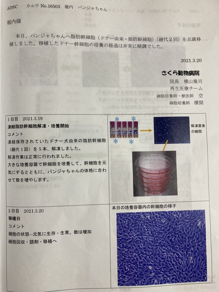 また今回の治療を通して、同じように苦しんでいるワンちゃんやネコちゃんたちの再生医療という可能性が大いにある治療の希望となれればと思います。