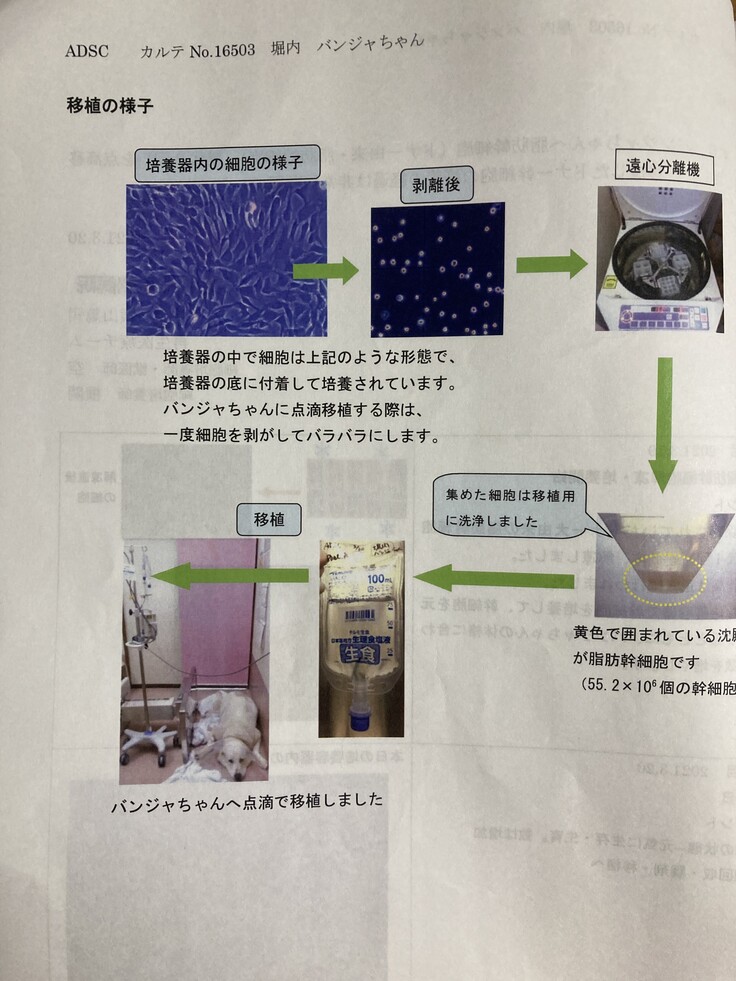 今回、治療をお願いしている、さくら動物病院様のご厚意で自分の細胞ではなく、ドナーの凍結細胞を点滴いただくことになりました。