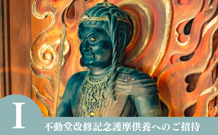 不動堂改修を記念した護摩供養にご参加いただけます。またご支援いただいたお名前を不動堂内の銅板に記し、永年掲載させていただきます。