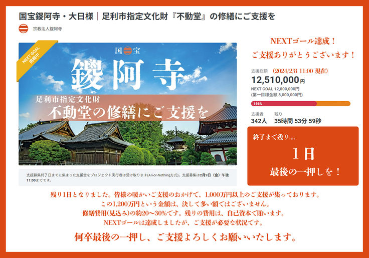 不動堂だけでなく、すべての文化財を後世に伝えるため、何卒あと一押しのご支援よろしくお願い申し上げます。