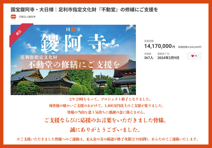 昨年12月13日より開始した本プロジェクト「国宝鑁阿寺・大日様|足利市指定文化財『不動堂』の修繕にご支援を」は、皆様からの多大なるご支援により、昨日2月9日23時に無事終了いたしました。