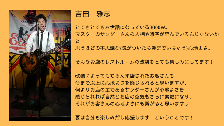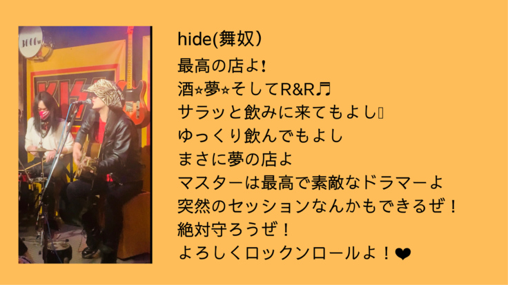コロナ終息後には音楽と笑顔が溢れるお店を取り戻したいと思います。