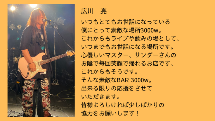 そんな折、新型コロナウイルス感染症による影響は計り知れず、Bar3000wもライブ・イベントはもちろんのこと、通常営業もままならず苦境に立たされております。