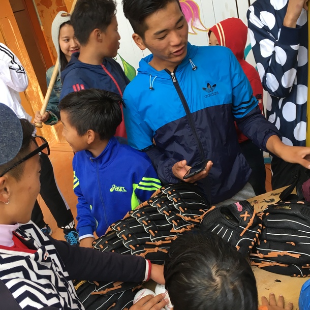 写真は、昨年の野球教室で道具を寄付した際に喜んでくれている場面です。