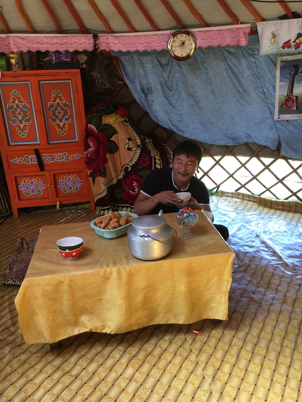 居住用のゲルの内部は、広くて快適です。早速ふるまわれた羊のミルクティとスコーンのようなお菓子が来客の際の定番だそうです!!