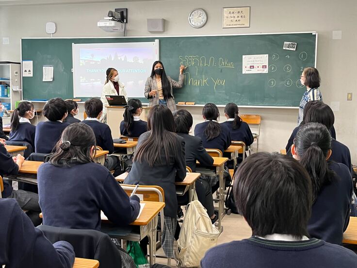 さらに、新プロジェクトとして、高校時代奨学金を受けていた学生の中から優秀な女子学生を日本に招待し、ホームステイや観光をしながら日本の中学・高校・大学を訪れ、学生たちと交流を持つというプロジェクトも行っています。学生にとって、人生の大きな刺激になるだけでなく、努力すれば夢がかなうということを実感し、さらに学業にいそしむきっかけになるだけでなく、日本の学生からも、自分たちの同世代の学生がここまで英語を学び、頑張っている姿を見て少なからず刺激を受けるという相乗効果も見られるようになっています。コロナの影響で、2年ほどは学生を日本に招待することができなくなってしまいましたが、ようやく今年、リンとネスという2名の学生を日本に招き、日本の中高生、大学生と交流を持つことができました。