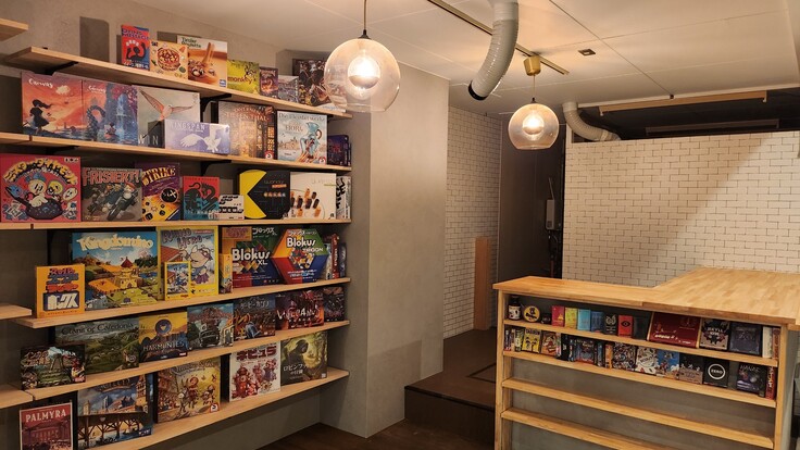 これを書いている今も内装工事の着工中でまだ全体が出来上がっていないのですが、お見せできる部分だけでもボドゲを置いてみて写真を撮ってみました!