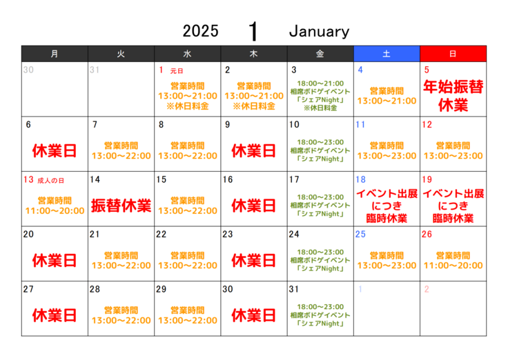 31日~4日までの営業時間は以下のカレンダーをご確認くださいませ。