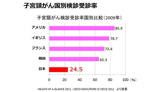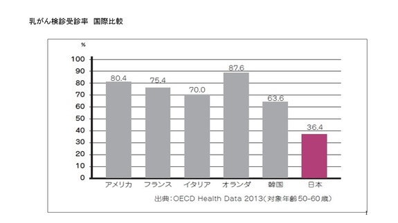 有効性が科学的に証明されている「乳がん・子宮頸がん検診」乳がん・子宮頸がん検診率が先進国では最低ラインです。