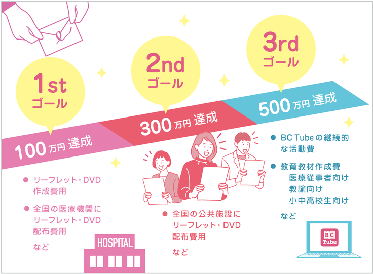 乳がんを早くに見つけて、早期受診・治療を目指す。言われればそうだと思うけど、ちょっと怖かったり、少し面倒だったりして、なかなか足が進まないものです。今回の活動を通して、一歩前に進むきっかけに利用してもらえたらなと思います。また、その支援はBC Tubeの今後の情報発信活動の拡大にも繋がって、きっと多くの方が助かると思います。ぜひ、多くの方のご支援をよろしくお願いいたします。