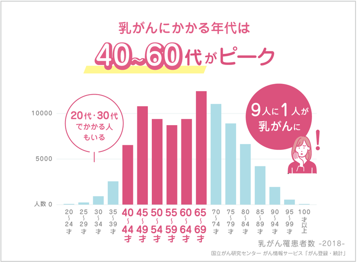 日本人女性の9人に1人が、生涯に乳がんになると言われています。一般的に、がんは年齢を重ねるほど罹患率が上がるのですが、乳がんはそれと異なり、30代後半から急激に増えていきます(文献3)。