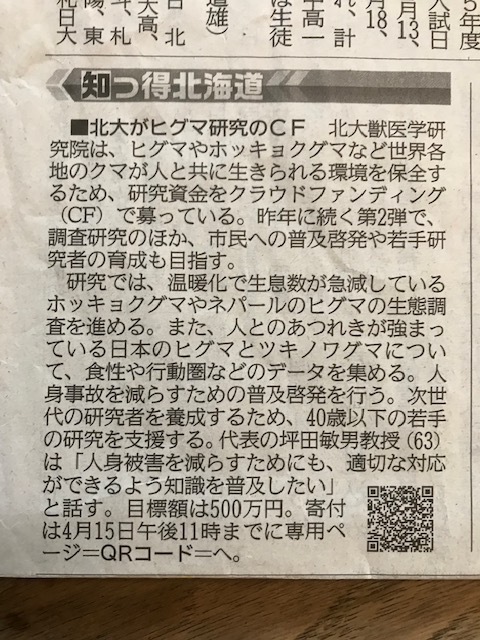 そして3月20日に北海道新聞で、本クラウドファンディングを取り上げていただきました。北海道新聞では、継続的にヒグマ問題を取り上げ、私も何回かコメントさせていただきました。ヒグマの生態調査の必要性も理解してくださっており、今回は好意的に記事にしていただきました。よりたくさんの方にこの取り組みを知っていただけたらと思います。