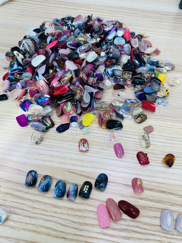 しかし今は「ちぐはぐデザイン」といい、片手5本ずつを違うデザインにするトレンドが流行していることと、色味を揃えて混ぜ合わせて梱包すると、このようにまるで新品のネイルチップセットになることが分かりました。
