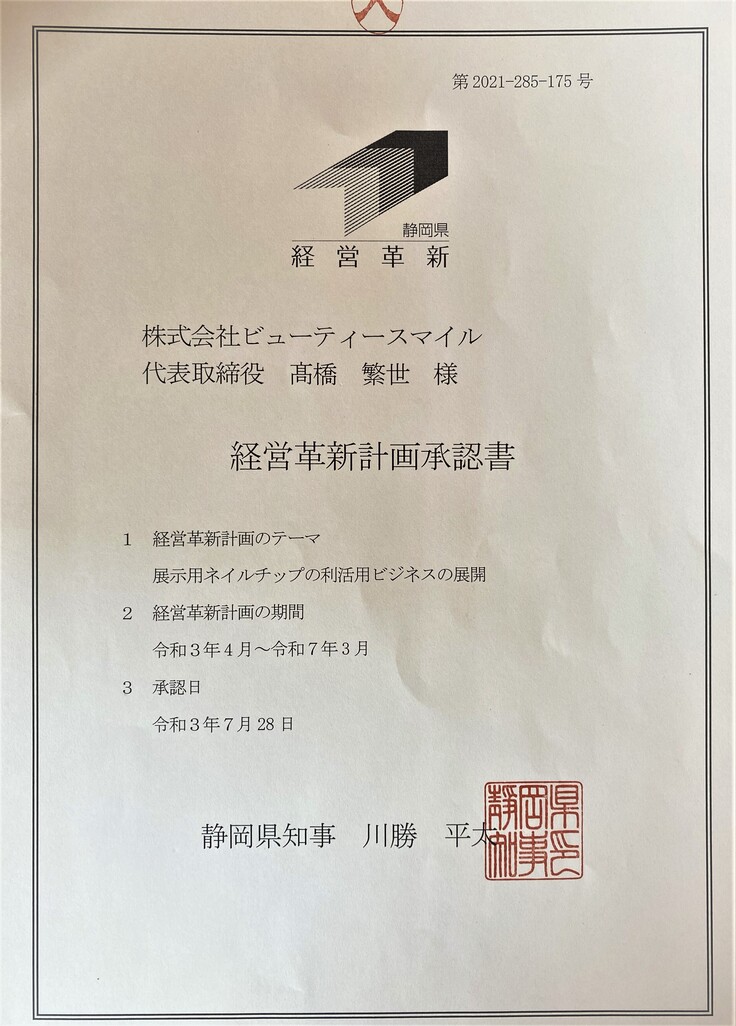 実は、この展示用ネイルチップ再利用の取り組みですが、浜松いわた信用金庫さん主催の「第2回チャレンジゲートで優秀賞」を頂いており、その時の計画で「今後の展開が見込めるため、国の補助を頂いて事業を進められるように」と、経済産業省の経営革新の申請をしておりました。