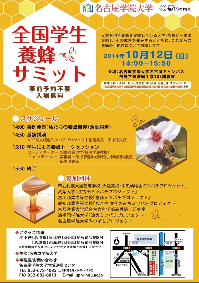 全国学生養蜂サミットは2014年に名古屋学院大学で第一回が行なわれました。