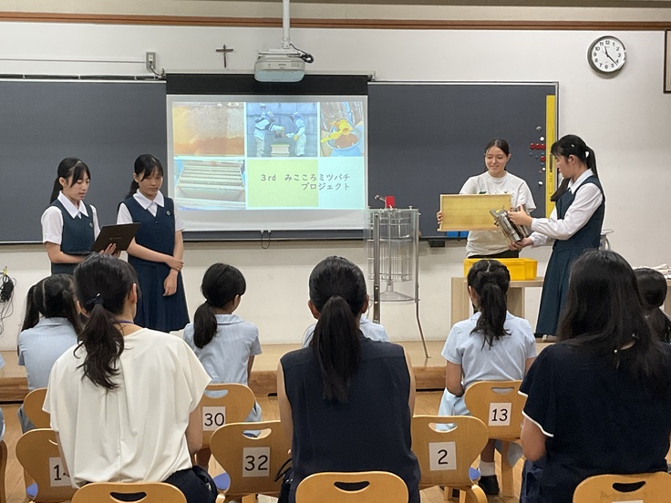 初中高の一環校の利点を活用して、初等科生向けに採蜜体験会やハチミツ味比べ会などの運営にも携わっています。