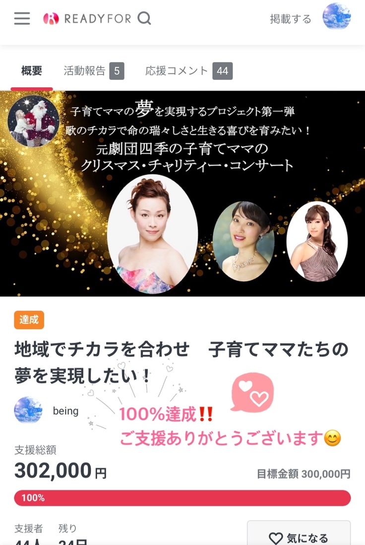 10月2日より始まりました「地域でチカラを合わせ 子育てママたちの夢を実現したい!元劇団四季の子育てママの“クリスマス・チャリティー・コンサート“」プロジェクトはお陰様で開始約1か月で目標金額を超えるご支援を頂きました。