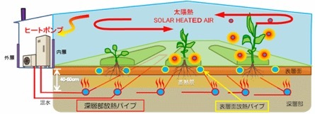 当方式は、地中深さ40~60cmに埋設したパイプで温水を供給し、冬には土壌を加温しバランスのよい微生物層をつくり、夏には太陽熱と放熱パイプ加温との併用で土壌を45℃以上に温め土壌消毒を行なうことで、化学肥料や農薬を使わないで野菜や花卉類を連作で高生産性で栽培できるハウス農業方式です。