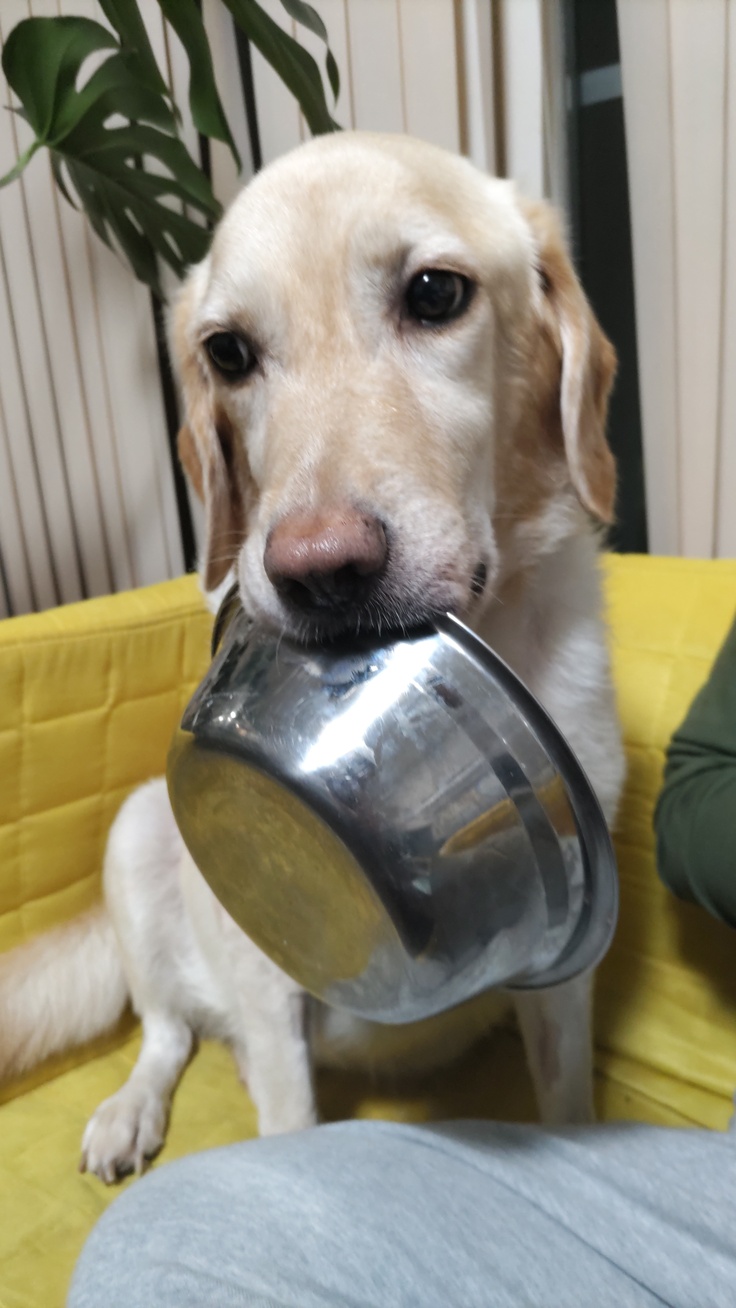 で、追っかけて取ろうとすると逃げ廻り、おかわり用意し始めるとここに入れてねと…口から離しガチャンて皿を置くやつです。
