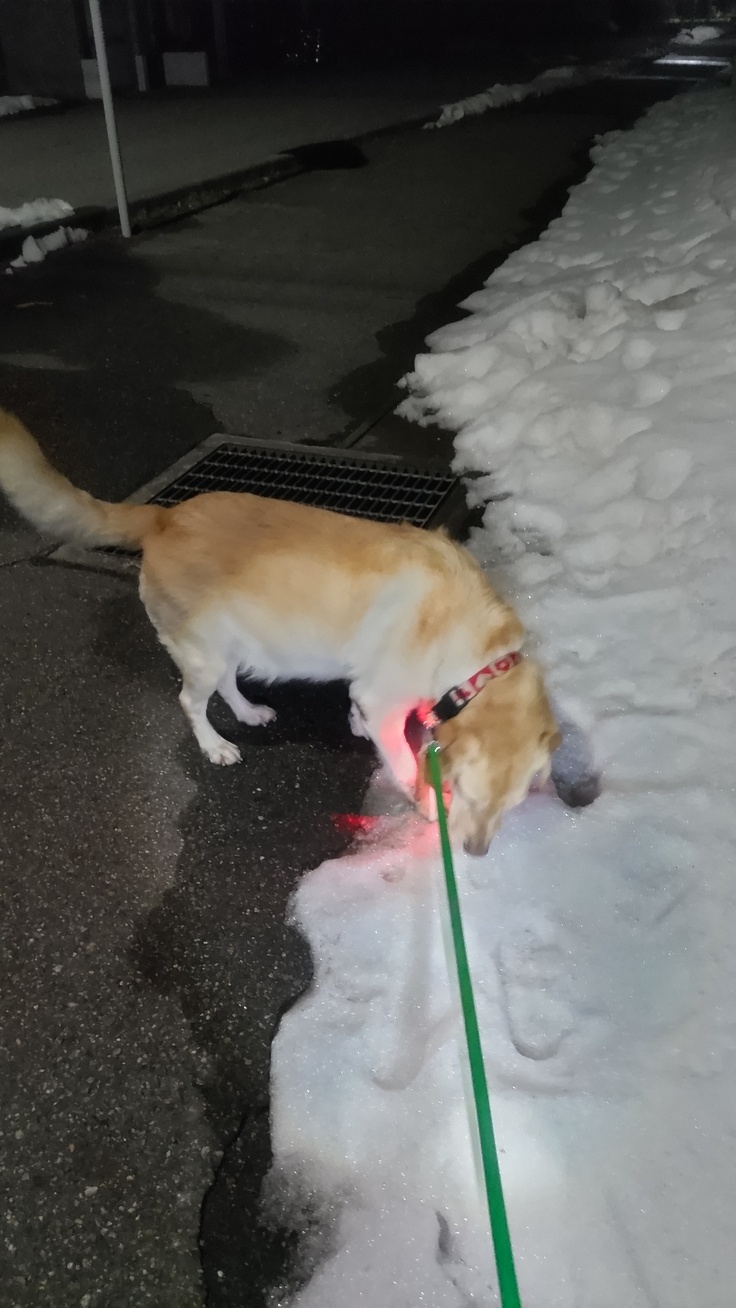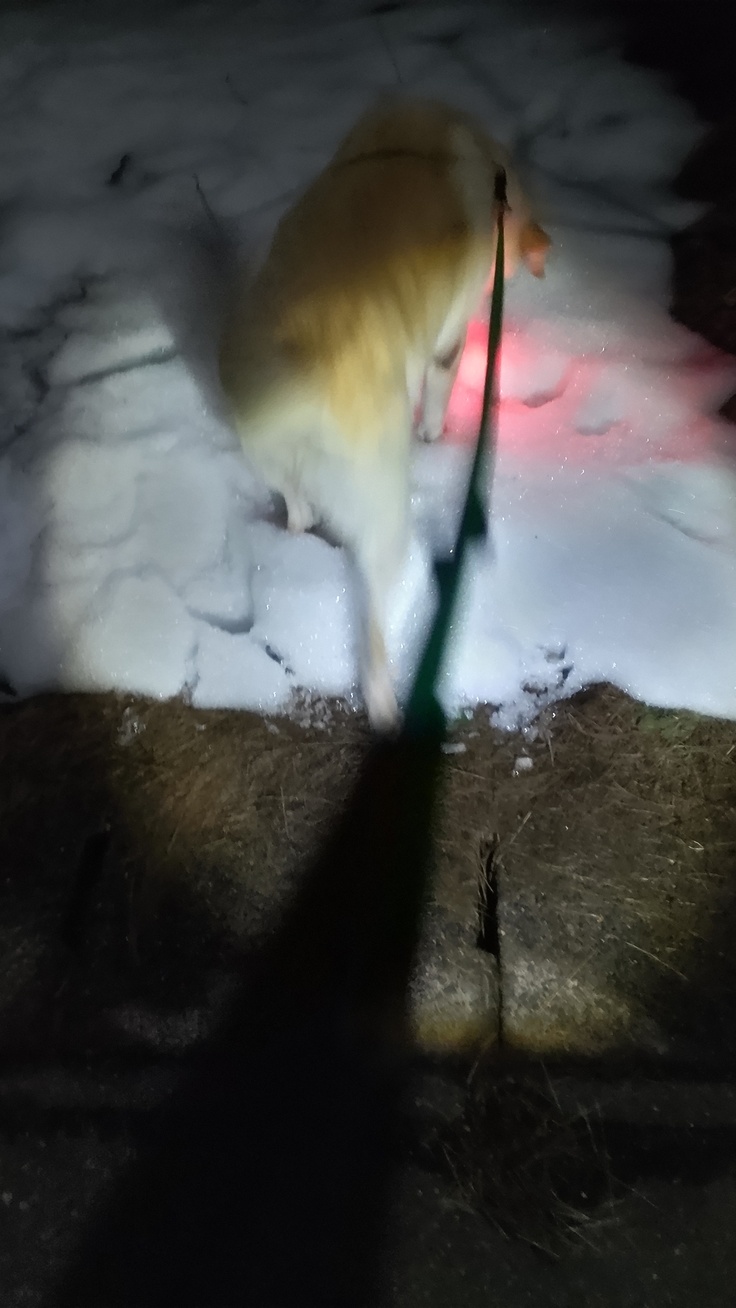 と言うこともあって夜中に散歩して来ました。赤く光ってるのは首輪に付けたライトです。