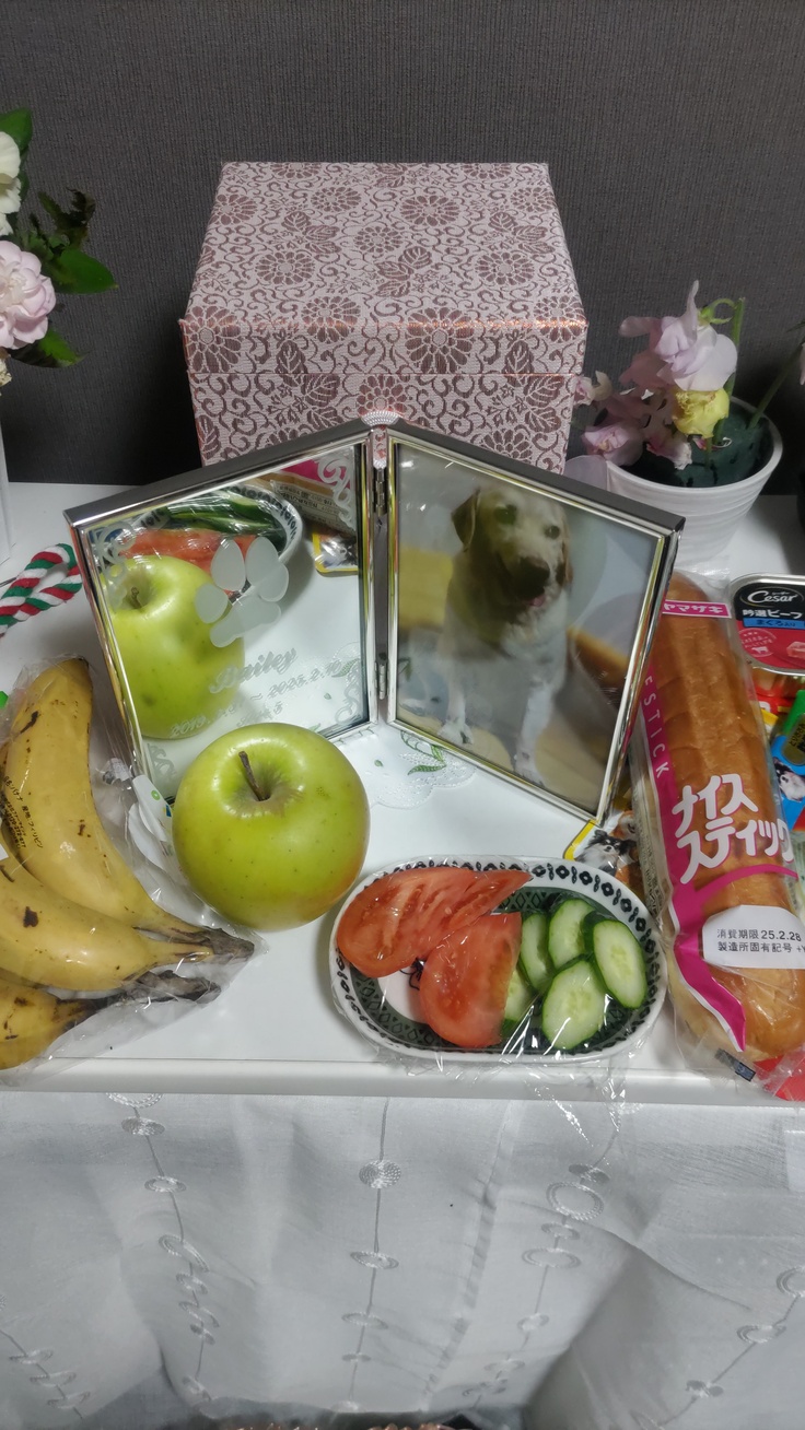 大好物で後半薬を飲むのに食べていたナイススティックと後半は食べなくなったバナナ。あんなに好きだったのに…と言う事で御供えしてます。