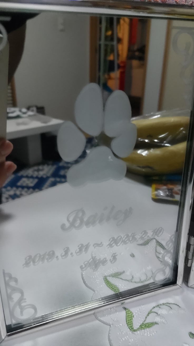 さて、火葬場で肉球を型取って作ったベイリーの写真立てが完成してきました。