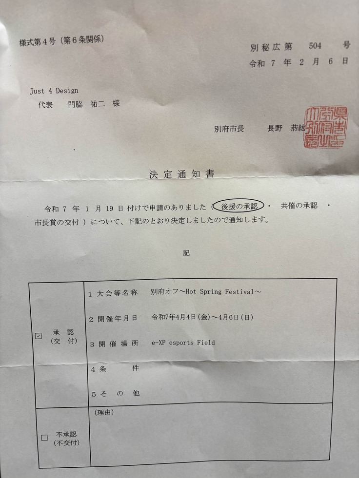 別府市からの後援承認の連絡がありました🙌