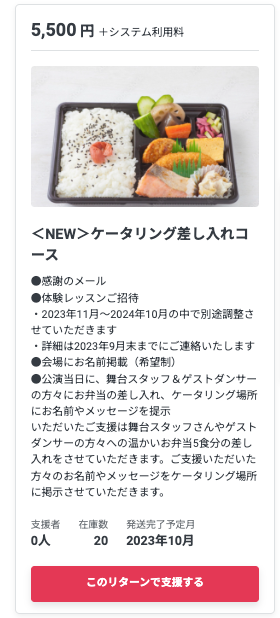 いただいたご支援は舞台スタッフさんやゲストダンサーの方々への温かいお弁当5食分の差し入れをさせていただきます。ご支援いただいた方々のお名前やメッセージをケータリング場所に掲示させていただきます。