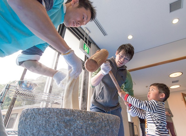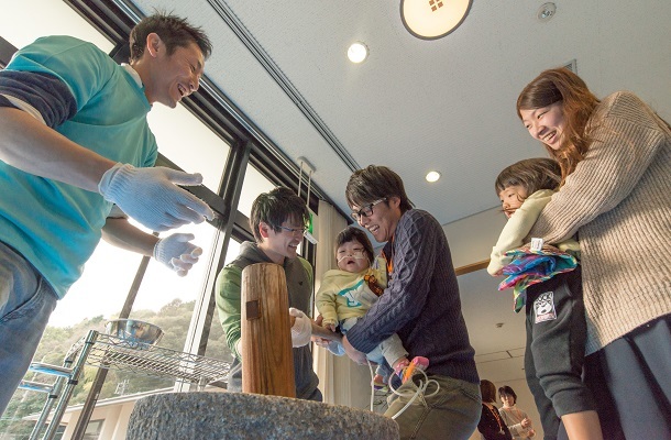 その後、ロビーでおもちつき行いました。医療的ケア児とそのきょうだいたちが親御さんやスタッフと一緒に重い杵をふりおろしてがんばりました。みんなで丸めたつきたてのおもちのおいしさは格別でした。
