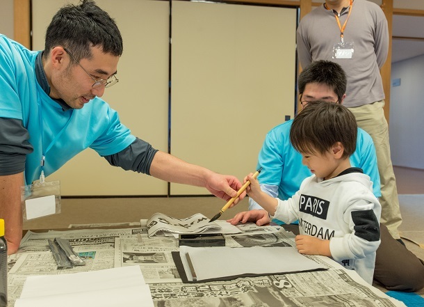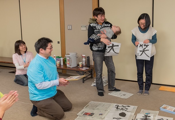座談会の後、書き初めを行い、今年1年の計や希望などを1人ずつ書きました。最後に1家族ずつ発表しあって参加証をお渡しし、お開きとなりました。書き初めでもっとも印象に残ったのは、「今年1年笑って過ごせますように」の「笑」とお子さんの名前の「大」をお父さん、お母さんが別々に書いて完成した「大笑」でした。参加者全員が笑って過ごせる1年になるように願って解散しました。