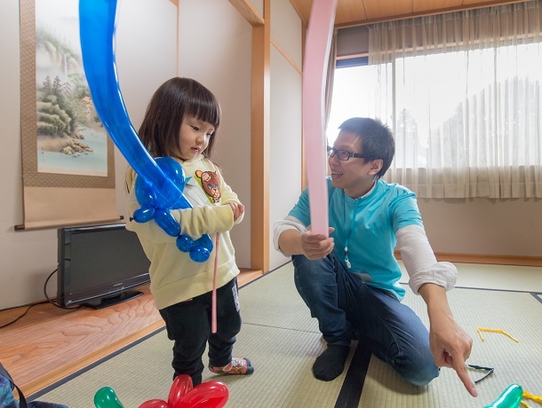 昼食後、お母さんグループ、お父さんグループに分かれて座談会を行いました。(スタッフも男性女性に分かれて参加しました。その間、こどもたちは遊び担当のスタッフと別室でバルーンアートで遊びました。
