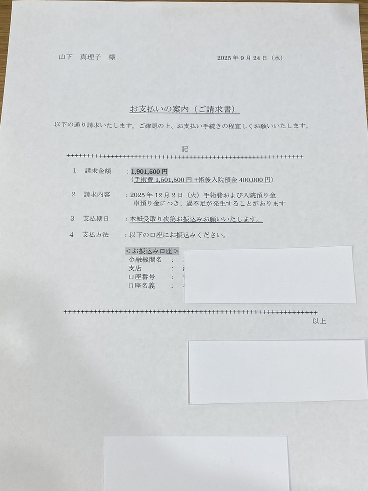 入院費用:400,000円(税込)(術後の状態によって変更の可能性あり)