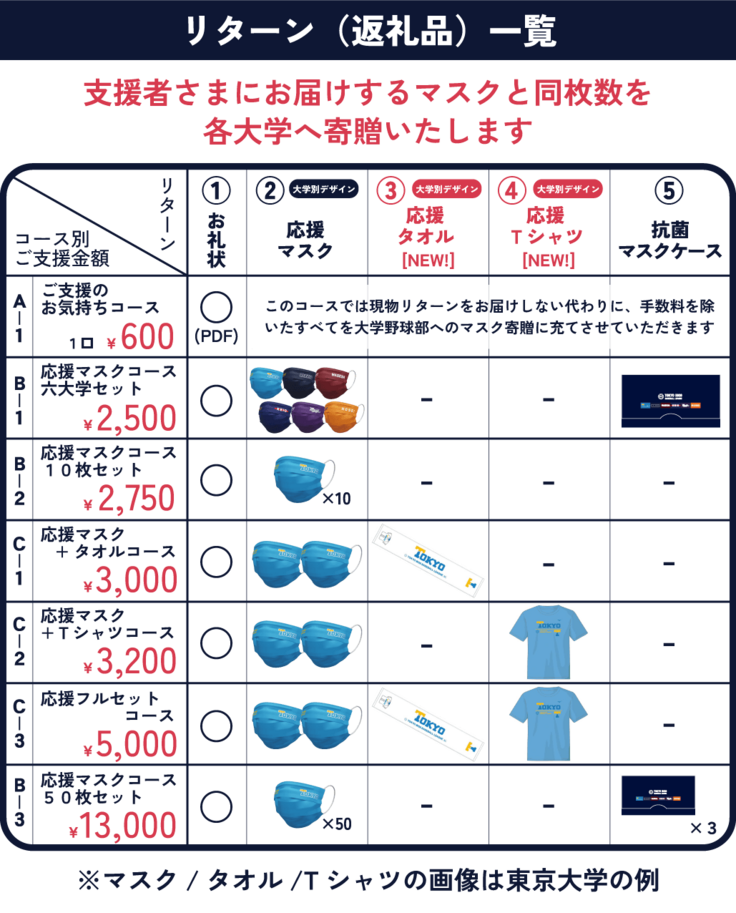 このプロジェクトでは、支援者さまへお届けする応援マスクと同じ数量分、各大学へも応援マスクを寄贈いたします。(東京六大学野球連盟を通じ寄贈)