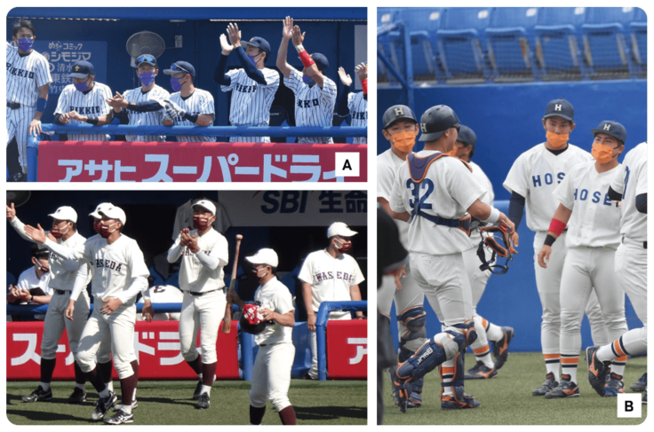 選手・大学関係者の皆さん、神宮球場にお越しになる観客の皆さま、遠方から応援される皆さま、皆でチームカラーのマスクを身につけることによる「応援の思いを込めた」感染防止対策の実現にご協力をお願いいたします。