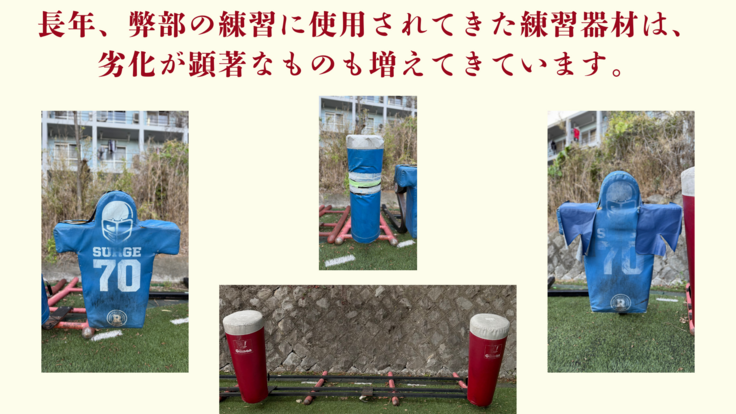 弊部は日本一という目標を掲げ、日々活動しております。しかし、創部以来、栄冠には手が届いておらず、関西の強豪校に勝利し、日本一を獲るためには、今以上のフィジカルとファンダメンタルの構築が必要と感じております。現在、恵まれた大学施設を使用させていただいておりますが、更なるチームの強化のため、選手のフィジカルアップのための栄養関係費の充実と老朽化した練習器材の新調を図りたく、ご支援をお願いする運びとなりました。皆様のご支援を結果という形でお返しし、弊部が日本一を獲るだけでなく、フットボール界の発展、成長に向けても尽力して参ります。重ねてご支援のほどよろしくお願い致します。
